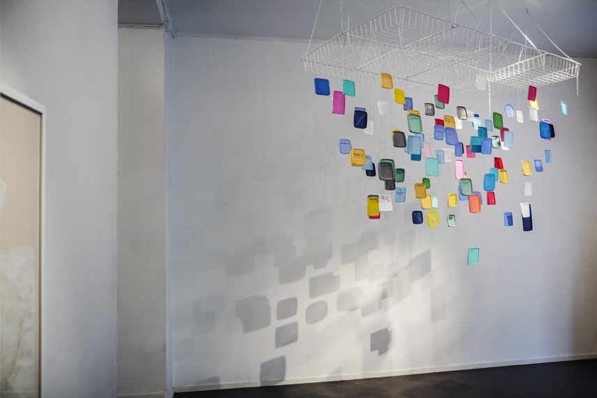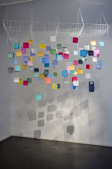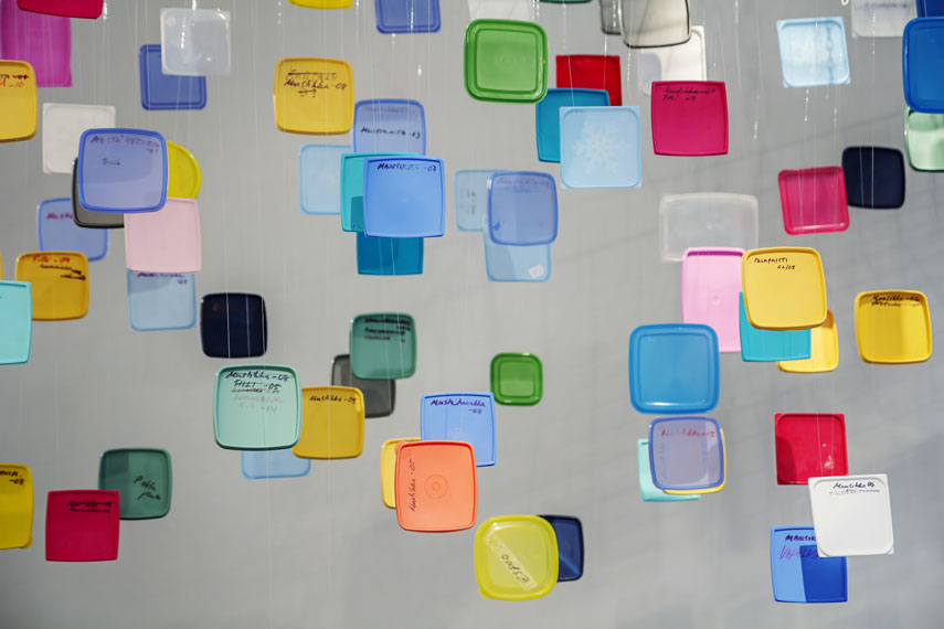 <<<< takaisin / back Pakastin.2014.Pakastinrasioiden kannet, siima, ritiläkorit. 4m x1mx 3,5m / Freezer, 2014. Freezer box covers, fishing line, crates. 4m x1mx 3,5m.